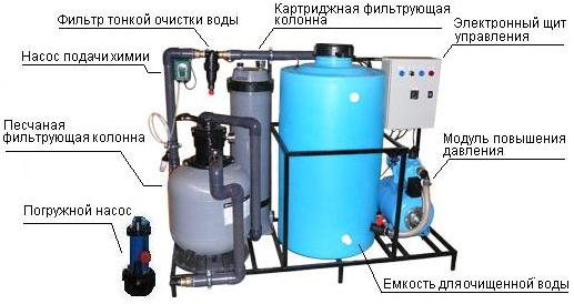 Контроль уровня воды в резервуаре, включение насосов производится с помощью системы автоматики.
